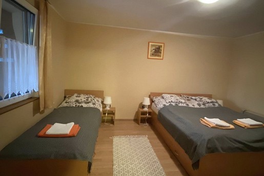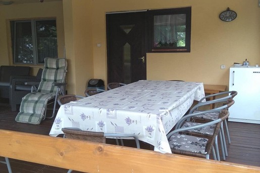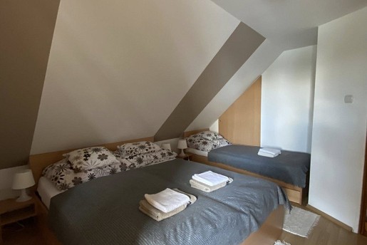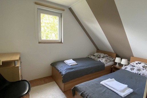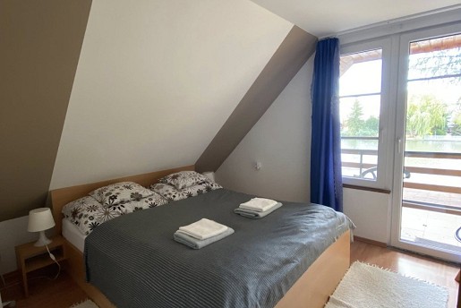 Az emeletre kényelmes lépcső vezet, ahol három szoba és egy további fürdő található WC-vel és zuhanyzóval. Két szoba terasszal rendelkezik, ahonnan gyönyörű kilátás nyílik a holtágra. Az egyik szoba három-, a másik kettő pedig kétágyas, így minden vendég számára kényelmes pihenést biztosít. Ágyneműt biztosítunk.
