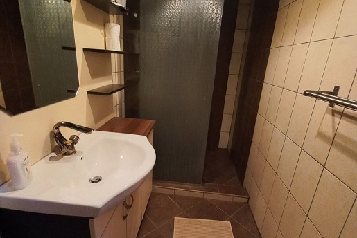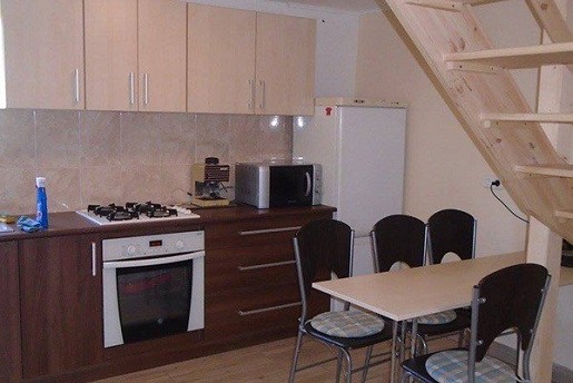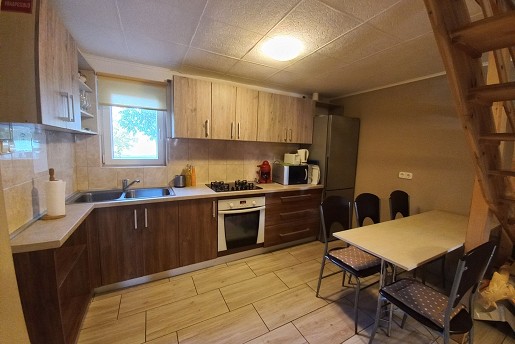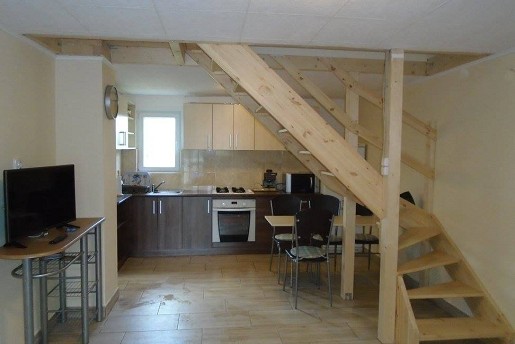 A földszinten egy szoba található franciaággyal és egy egyszemélyes ággyal, valamint tágas nappali kihúzható, kétszemélyes ülőgarnitúrával. Az amerikai konyha teljesen felszerelt (mikrohullámú sütő, sütő, főzőlap, kávéfőző, hűtőszekrény), emellett ezen a szinten egy fürdőszoba is helyet kapott WC-vel és 140x120 cm-es épített zuhanykabinnal.